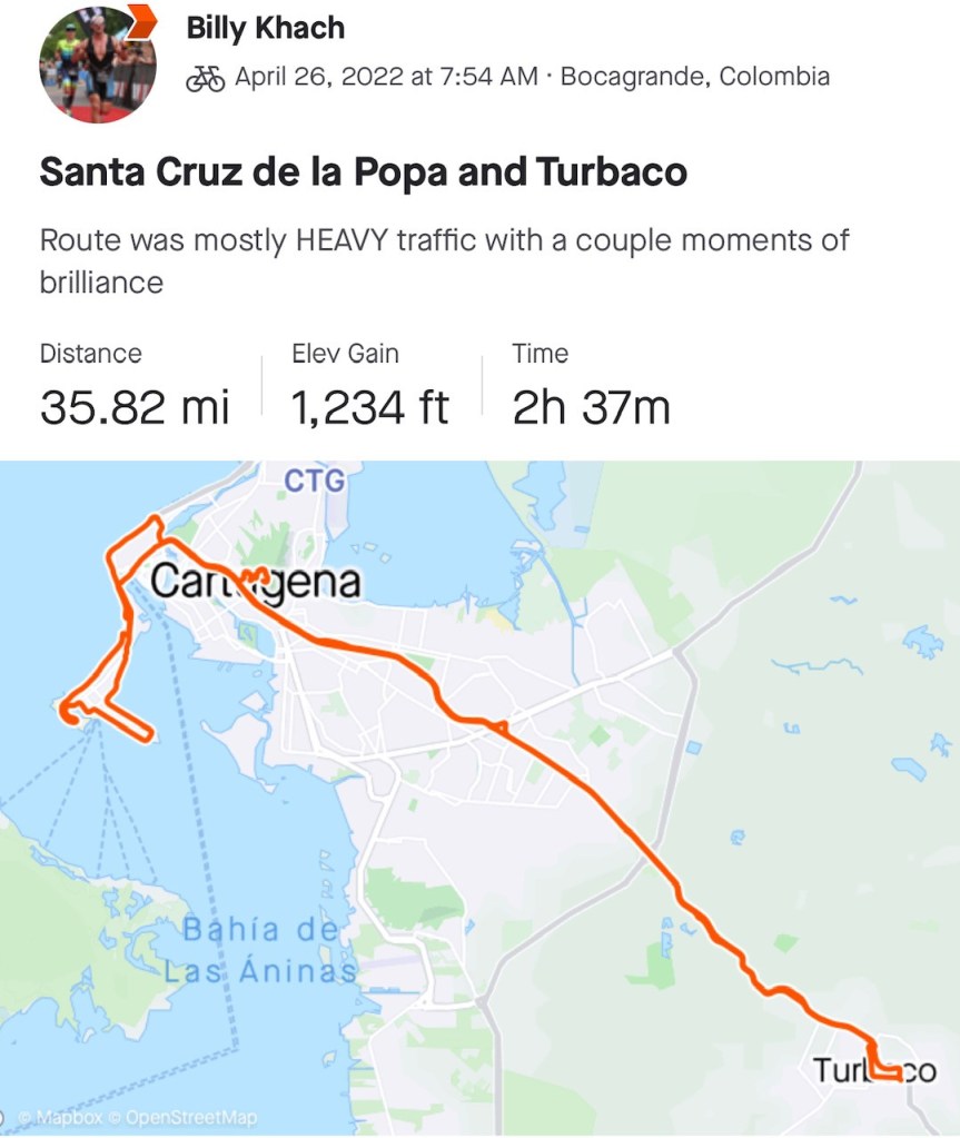 I was advised against this route by the local bike shops due to heavy traffic and after my experience riding to Turbaco which WAS recommended I decided to nix it from my itinerary, so I have no first hand experience or tips. It’s an option for anyone brave enough to give it a go.
